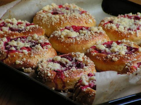 W tym czasie przygotować kruszonkę: masło, mąkę i cukier rozetrzeć palcami na grudki, wstawić do lodówki. Kiedy bułeczki podwoją swoją objętość, posmarować je rozmąconym jajkiem, posypać kruszonką i wstawić do piekarnika nagrzanego do 190 stopni C. Piec ok. 30 minut tak, by ciasto nabrało jasnobrązowego koloru i po wyjęciu było pięknie upieczone.
