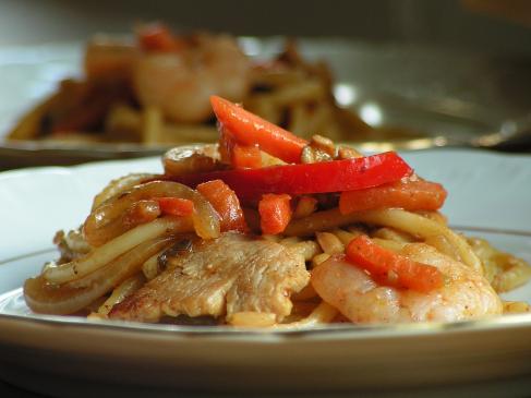 Rozgrzać wok. Wlać olej sezamowy i na gorący wrzucić kawałki kurczaka, mieszając nieustannie aż do zbrązowienia się mięsa. Wcisnąć wtedy czosnek, dołożyć cebulę, smażyć przez chwilkę mieszając. Kiedy cebula zrobi się szklista, dorzucić warzywa i paprykę i chwilkę je podsmażyć potrząsając wokiem i mieszając smażące się składniki. Dodać krewetki, pastę tom yum i sos ostrygowy, wymieszać, podlać bulionem, wsypać mąkę, zagęścić, wrzucić makaron, wymieszać tak, by oblepił się sosem. Podawać od razu po zrobieniu.