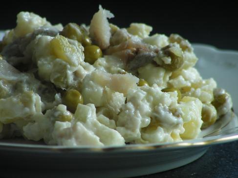 Śledzia, ziemniaki, jabłko, ogórki i cebulę pokroić w drobną kostkę i włożyć do miski. Dodać odsączony groszek, sok z cytryny, majonez, musztardę, szczyptę soli, cukru i pieprzu. Wszystko delikatnie wymieszać. W razie braku odpowiedniej przyprawy doprawić do smaku. Odstawić w chłodne miejsce na 30 minut przed podaniem. Tak przyrządzoną sałatkę można podawać na półmisku, obłożoną ćwiartkami jajka ugotowanymi na twardo i posypaną natką pietruszki.